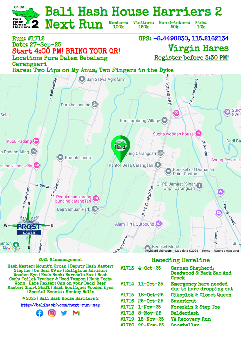 Bali Hash 2 Next Run Map - #1712 - Pura Dalem Bebalang Carangsari - 27-Sep-25