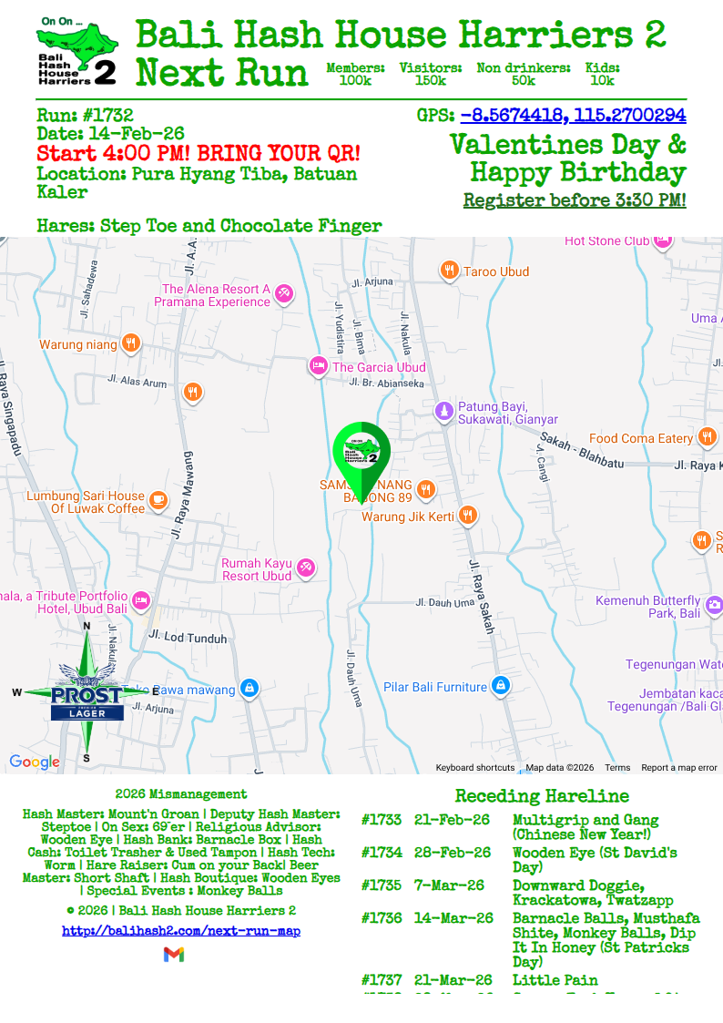 Bali Hash 2 Next Run Map - #1732 - Pura Hyang Tiba, Batuan Kaler - 14-Feb-26