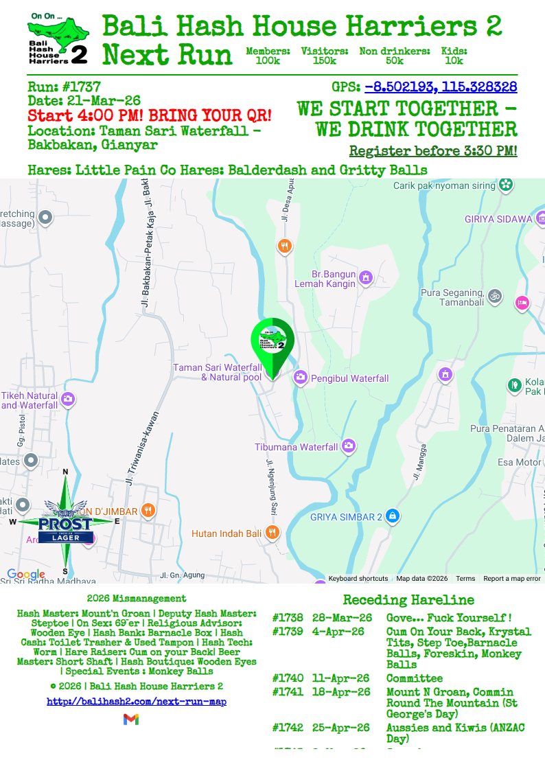 Bali Hash 2 Next Run Map - #1737 - Taman Sari Waterfall - Bakbakan, Gianyar - 21-Mar-26
