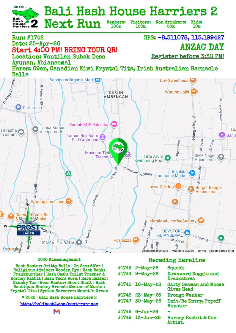 Bali Hash 2 Next Run Map - #1742 - Wantilan Subak Desa Ayunan, Abiansemal - 25-Apr-26